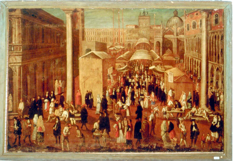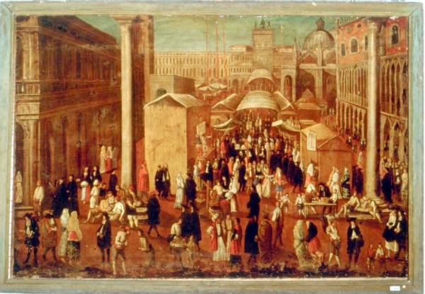 - NOTIZIE STORICO CRITICHE Non sono state rintracciate nitizie sulla provenienza del dipinto che, seppure di fattura popolare, presenta un certo interesse documentario poichè riprende con intenti cronachistici lo svolgersi del mercato in piazza S. Marco a Venezia, animato da numerose macchiette ben definite negli abiti del tempo. \nL'ignoto autore del quadro in oggetto sembra essersi ispirato all'opera del pittore veneto Luca Carlevaijs.