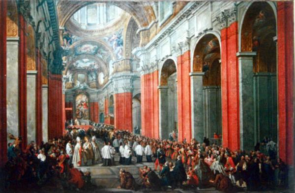 Nella prospettiva d'angolo dell'interno di una chiesa, un corteo di prelati procede verso l'altare, mentre una folla di spettatori si inginocchia al suo passaggio.