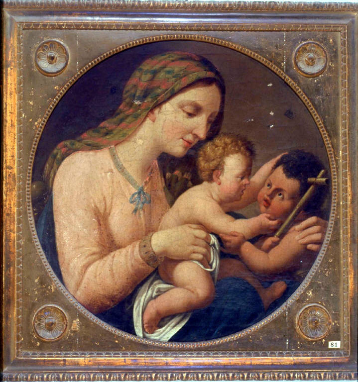 - NOTIZIE STORICO CRITICHE Non sono reperibili notizie sulla provenienza dell'opera nei documenti posseduti dai Musei Civici. \nLa composizione in tondo si ispira chiaramente alla celebre Madonna della Seggiola di Raffaello (1514) conservata a Palazzo Pitti. Rispetto a questo modello, però, il Bambino, anzichè voltare le spalle a S. Giovannino, tende le mani verso di lui. Il duplice abbraccio che ne risulta - della Vergine e di Gesù - richiama un altro fortunato modello rinascimentale: il cartone di Leonardo con S. Anna, la Madonna il Bambino e S. Giovannino (1498-1500) alla National Gallery di Londra che, pure, è alla base di composizioni di seguaci leonardesche testimoniate, per esempio, dalla presenza di copie cinquecentesche da Cesare da Sesto (Madonna col Bambino, S. Giuseppe, S. Giovannino e Santi) e da Cesare Magni (Sacra Famiglia con S. Giovannino) (Carminati, 1999) nella collezione del cardinale milanese Cesare Monti passate alla Quadreria dell'Arcivescovado.\nRispetto a queste opere, la tela di Como rivela una prevalente tensione idealistica di estrazione emiliana, alimentata, a Bologna, dall'insegnamento dei Carracci che nella loro scuola degli Incamminati, aperta verso il 1585, invitavano gli allievi ad esercitarsi guardando ai maestri del Rinascimento.