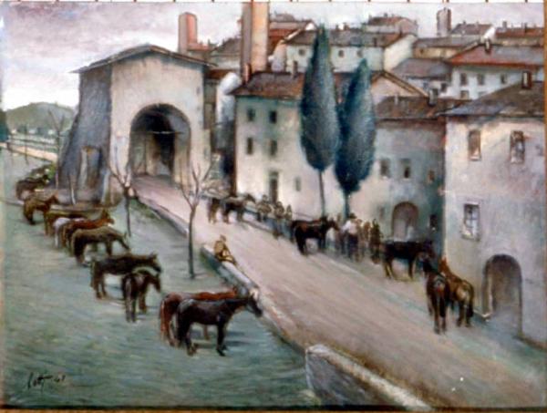 Sullo sfondo di un gruppo di case rustiche, una strada è occupata ai lati da cavalli e contadini.