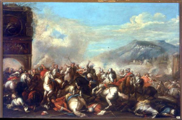 - NOTIZIE STORICO CRITICHE Come osserva l'estensore della scheda cartacea "[...] non è possibile indicare la provenienza di questo dipinto, nè il periodo cui risale il suo ingresso nei Musei Civici di Como. Va tuttavia segnalata la presenza nelle collezioni comunali di numerose 'battaglie' parte delle quali appartenenti agli arredi di villa Olmo, acquistata dall'Amministrazione cittadina nel 1924. Purtrotto la sommarietà delle descrizioni dei beni mobili già conservati nell'edificio non permette di identificare questa tela". Va, inoltre, osservato che la presenza di altri dipinti con la raffigurazione di battaglie -tra i quali la tela inventariata con il n. 7 stilisticamente affine all'opera qui schedata- nelle collezioni comunali "testimoniano nella città lariana della presenza di un gusto nettamente formulato, che ben si accorda con gli orientamenti dominanti del collezionismo lombardo della seconda metà del Seicento e del Settecento" (Natale, 1981, 93).