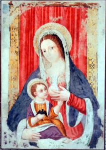 La Madonna è rappresentata frontalmente mentre porta al seno il Bambino.