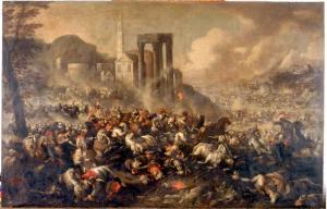 E' raffigurata una battaglia di cavalleria tra turchi e cristiani davanti alle mura di una città.