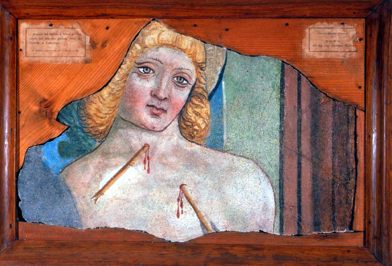 (PSSSC, 1878). La costruzione venne demolita prima del 1878 durante i lavori di allargamento detta Regina. In tale occasione l'ing. Monti tentò il recupero dell'intero affresco, salvando tuttavia solo un piccolo frammento, che donò alla Società Storica Comense, la quale lo cedette al Museo Civico".\nNonostante il cattivo stato di conservazione e le ridipinture sembra di potere ascrivere il manufatto a Battista da Musso, largamente operoso in Alto Lario tra la fine del Quattrocento e il primo decennio del Cinquecento, ma già attivo come pittore nel 1477 (Mascetti, 1993). In particolare si possono istituire raffronti tra il S. Sebastiano di Como e quello affrescato nel 1502 presumibilmente dal Malacrida nella chiesa dei SS. Pietro e Paolo a Garzeno (Rovetta, 1988) che condividono le medesime caratteristiche stilistiche proprie di un "eclettismo povero" che innesta componenti ferraresi su un'impronta foppesca, riprese dal 'Vicino da Ferrara' (Rovetta, 1998, 12) . - TIPOLOGIA SCHEDA Opere/oggetti d'arte