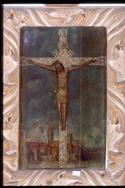 - NOTIZIE STORICO CRITICHE Il dipinto, di ignota provenienza, riproduce il SS. Crocifisso venerato nella basilica della SS. Annunziata a Como. Come analoghe raffigurazioni, tra le quali si segnala la tela con la Veduta di Como con i Santi patroni appartenente alle Collezioni dei Musei Civici (inv. n. 135), sullo sfondo è raffigurata una veduta di Como con la cattedrale completa di cupola. Questo dato fornisce nel 1740 un sicuro termine post quem per la datazione del dipinto, le caratteristiche stilistiche del quale inducono comunque a posticiparne l'esecuzione almeno all'inizio del XIX secolo.