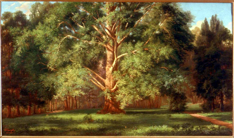 Un enorme albero si innalza dal prato di villa Olmo, tra un fitto intrico di altri alberi arretrati.
