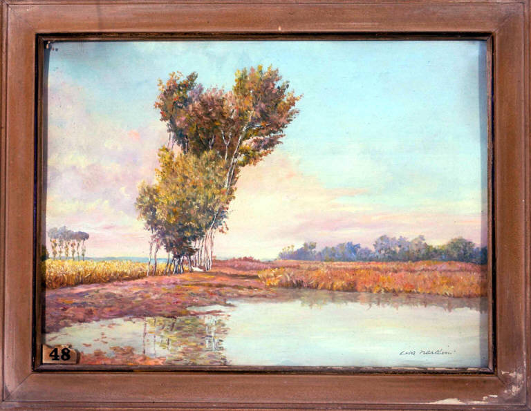 Paesaggio di pianura con palude in primo piano; campi; un gruppo di alti alberi verso il centro ed altri sullo sfondo.