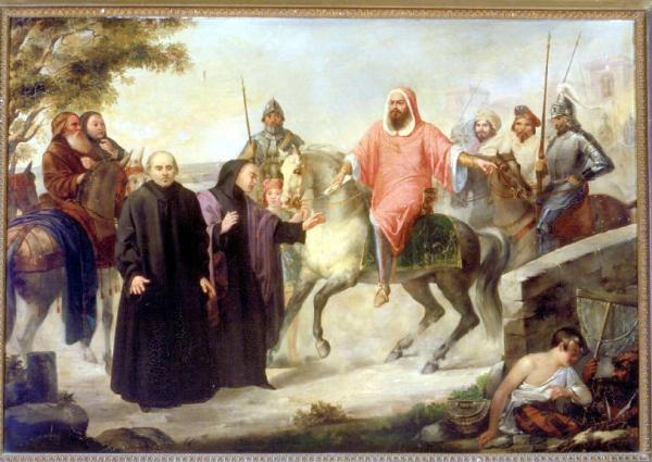 Un gruppo di cavalieri segue un personaggio su un cavallo bianco, con mantello e cappuccio, che tende un rotolo ad un frate appiedato. Sullo sfondo, a sinistra, si vedono le chiome di un albero e a destra le torri di un castello. In primo piano a destra una donna seduta e una figura maschile sono nascosti da un muricciolo.