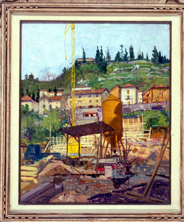 Si vedono impalcature e una gru per la costruzione di una casa; in posizione arretrata un gruppo di case e la sommità di una collina con qualche albero (Monte Olimpino?).