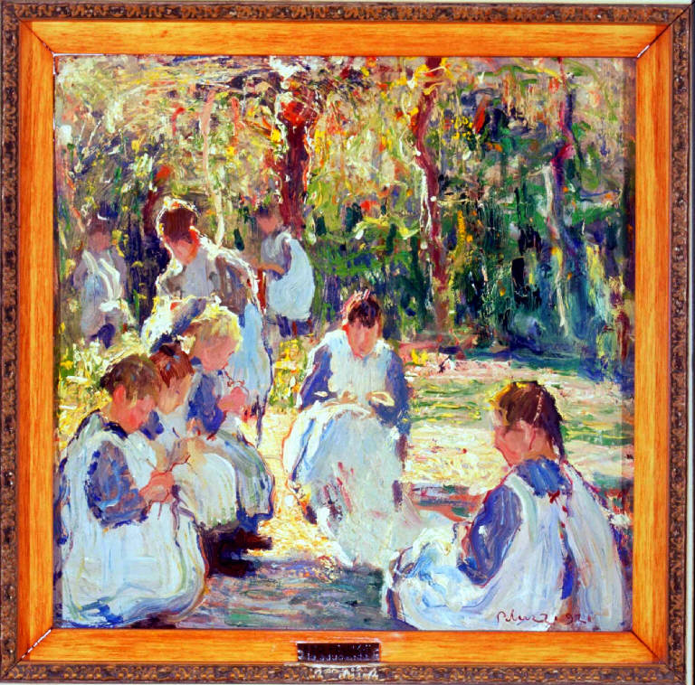 - NOTIZIE STORICO CRITICHE Il dipinto, che raffigura ragazze con grembiule occupate in lavori di cucito, fu realizzato dal pittore ligure prima del suo esordio alla mostra personale del 1922 alla Società Promotrice delle Belle Arti di Torino. Pittore prevalentemente di paesaggio, la critica riconosce tra le prove migliori del Peluzzi quelle eseguite durante il primo periodo di soggiorno al Santuario di Savona (1919-1923) - al quale si ascrivono altri due dipinti conservati nella Pinacoteca Civica di Como (nn. inv. 809, 810) - nei quali il pittore "reinterpreta in chiave originale il divisionismo italiano: infatti, sensibile intreprete della lezione di pelizza, scandisce la luce attraverso un acceso cromatismo ed una pennellata densa e pastosa" (Beringhelli, 1991, 237).
