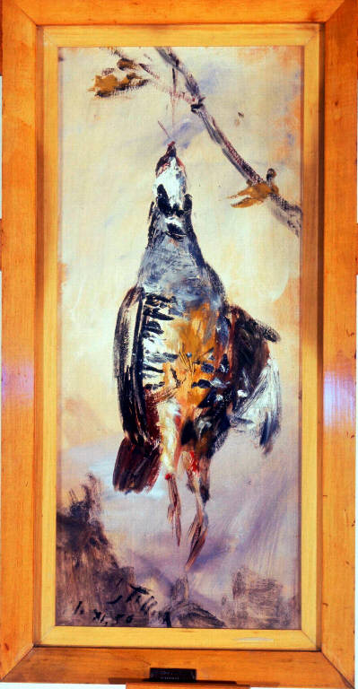 Il dipinto, che rappresenta una coturnice appesa a un ramo con una cordicella, fa parte della collezione donata nel 1999 dalla famiglia Feloy al Comune di Como, della quale fanno parte diversi quadri raffiguranti animali morti e scene di caccia di varie e poche e stili.\nGuido, figlio di Cesare Tallone, si formò presso il padre insegnante, dapprima, all'Accademia Carrara di Bergamo e, successivamente, all'Accademia di Brera. Dopo l'iniziale produzione caratterizzata soprattutto da ritratti, espose anche paesaggi e nature morte, come i due esemplari appartenenti alle Collezioni Civiche di Como che si avvicinano, tra l'altro, a soggetti analoghi (