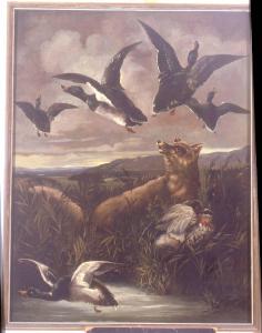 Presso uno specchio d'acqua una volpa tenta di catturare le anatre che, sorprese, si alzano in volo.
