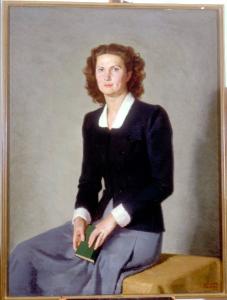 La donna è rappesentata in posizione seduta e girata di tre quarti, su uno sfondo neutro.