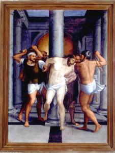Cristo, all'interno di un tempio, è legato ad una colonna che funge da asse di simmetria per la composizione, con gli sgherri collocati ai suoi lati e sul retro.