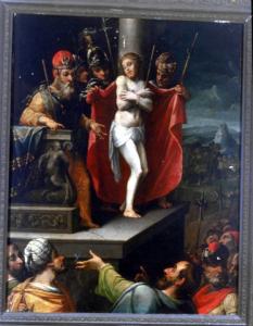- NOTIZIE STORICO CRITICHE Il dipinto è entrato a far parte delle collezioni dei Musei Civici di Como nel 1998 con il legato Bosisio. Esso rappresenta Cristo davanti a Pilato che lo mostra al popolo. La figura di Gesù è eretta davanti ad una colonna e a un mantello rosso che due sgherri si apprestano ad avvolgergli attorno al corpo, secondo uno schema iconografico vagamente ispirato al celebre dipinto di Sebastiano del Piombo nella cappella Borgherini nella chiesa di S. Pietro in Montorio a Roma (1521-1524 ca.) del quale erano diffuse numerose copie cinquecentesche. Il dipinto di Como si inserisce nel clima culturale lombardo del tardomanierismo mostrando influssi della pittura nordica nelle asprezze del paesaggio montuoso sullo sfondo, a destra, e nell'accentuazione quasi caricaturale dei tratti fisionomici delle figure.