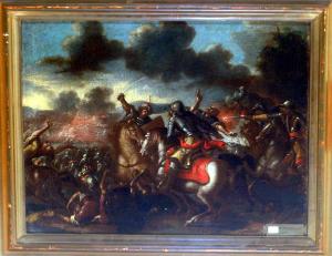 - NOTIZIE STORICO CRITICHE Il dipinto, insieme alla tela corrispondente al n. inv. 321, caratterizzati dalle stesse dimensioni e dalla stessa mano, sono da identificare con due tele di battaglia originariamente conservate nella villa di Lucino degli Olginati. Come ha già osservato la Rizzini nella scheda d'inventario del pendant, i due quadri, "di modesta qualità, sono databili al sec. XVIII; l'anonimo autore si sofferma a illustrare un episodio marginale di un evento bellico, nel quale la drammaticità del momento è resa in modo convenzionale e generico".
