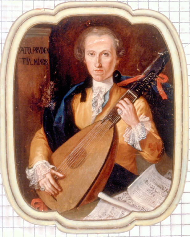 (1784). Tuttavia, questa rappresentazione non allude all'attività letteraria del Giovio che, invece, viene qui raffigurato in sembianze giovanili nell'atto di suonare un chitarrone. \nPer quanto riguarda l'autore del dipinto, come osserva l'estensore della scheda cartacea: "[egli] mostra una buona qualità di esecuzione nella parte bassa del dipinto (mani, pizzi ai polsini ...), mentre sembra scadere in un fare più duro e manierato nel volto del personaggio". Il quadro, dunque, riveste prevalentemente un interesse documentario. - TIPOLOGIA SCHEDA Opere/oggetti d'arte
