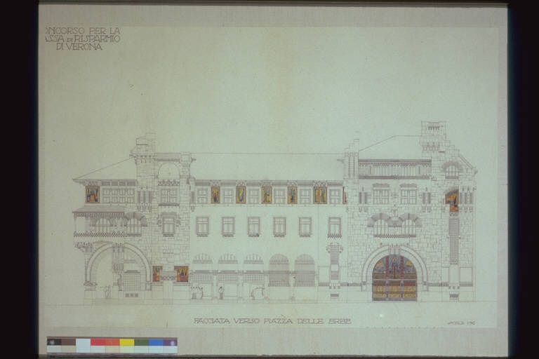 Nuova sede della Cassa di Risparmio di Verona. Prospetto principle. Facciata verso Piazza delle Erbe. PROSPETTO PRINCIPALE DELLA FACCIATA VERSO PIAZZA DELLE ERBE DELLA NUOVA SEDE DELLA CASSA DI RISPARMIO DI VERONA