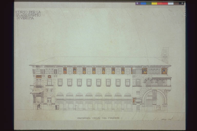 - NOTIZIE STORICO CRITICHE Il 15 giugno 1913 venne bandito un concorso internazionale per la nuova sede della Cassa di Risparmio di Verona in Piazza delle Erbe, con la prescrizione ai concorrenti di non creare dissonanze con gli edifici adiacenti, inserendosi armonicamente nel composito ambiente urbano senza alterarne la fisionomia. L'architetto Arrigo Cantoni partecipò con un'equipe di collaboratori scelti nell'ambito di competenze diverse, fra i quali Antonio Sant'Elia e il pittore Leonardo Dudreville. Il progetto dello studio Cantoni, presentato con il motto "Costruire", si classificò tra i cinque finalisti: ma la giuria non ritenne nessun lavoro soddisfacente e invitò gli autori ad una seconda prova più aderente alle condizioni del bando. Sant'Elia e Cantoni ripresentarono il progetto con modifiche senza però ottenere miglior successo. Nel dicembre 1914 fu infatti proclamato vincitore l'architetto G.B. Milani.\nIl disegno si riferisce alla prima versione del progetto, in cui l'apporto di Sant'Elia risulta evidente.