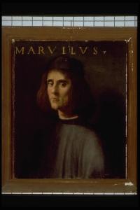- NOTIZIE STORICO CRITICHE La casa avita dei Giovio in Como è quella oggi corrispondente al Museo Archeologico. L'ultimo discendente Giovio, del ramo di Ottavio, e cioè Francesco figlio di Giovan Battista, divise la sua collezione di ritratti tra le figlie. cfr. R.Pavoni, 1983, p.38 e 44.\nDal presente dipinto deriva l'incisione di Tobias Stimmer (P.Giovio, 1577) che a sua volta fu il modello di un ritratto pubblicato da Croce e da questi ritenuto l'originale in possesso del Giovio (cfr.B.Croce, 1938). Del dipinto esiste anche una copia agli Uffizi.\nIl dipinto fu ritenuto copia di bottega botticelliana dell'originale del Botticelli, già nella collezione Cambò de Guardans di Barcellona, dipinto tra il 1491 e il 1492 in occasione di un soggiorno a Firenze del Marullo, ospite di Lorenzo di Pierfrancesco de' Medici. In seguito al restauro del 1979 venne attribuito invece a Ridolfo del Ghirlandaio da P.L.De Vecchi, Collezioni Civiche di Como, 1981.