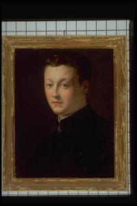 - NOTIZIE STORICO CRITICHE Il ritratto venne probabilmente tolto dal Museo di Borgovico per essere portato nella collezione di Ottavio Giovio situata nella casa avita dei Giovio, oggi corrispondente al Museo Archeologico. cfr. R.Pavoni, 1983, p.38. Qui rimase agli eredi con cognome Giovio fino circa alla metà del xix secolo, quando l'ultimo discendente, Francesco Giovio, divise fra le figlie la collezione dei ritratti. Questo dipinto passò probabilmente a Beatrice Mollinary, dato che il ritratto venne donato al Museo di Como dalla Acchiappati, erede Mollinary.\nNon si è trovata menzione di questo quadro negli scritti del Giovio nè in documenti relativi al Museo. Esso presenta nella configurazione del volto tratti tipici di personaggi di casa Medici e in particolare di Cosimo I e dei suoi figli. Il ritratto potè venire in possesso del Giovio durante il suo ultimo soggiorno a Firenze nel 1551-2, o più probabilmente venne inviato al Museo dopo la morte del Giovio. cfr. P.L.D Vecchi, 181, p.45.