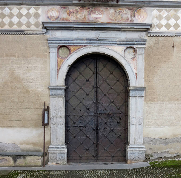 Portale monumentale costituito da coppie di paraste, su quelle interne si imposta un arco a tutto sesto inscritto nello spazio architravato dato dall'inserimento di un secondo ordine di corte lesene. I plinti alla base del portale sono decorati con coppie di rosette inserite in cornici quadrate modanate, così come il sottarco. In mezzeria le paraste mostrano dei tondi a bassorilievo che raffigurano, partendo da sinistra, Caio, Abele, Adamo ed Eva (nel risvolto sinistro), la creazione di Adamo (nel risvolto di destra), la creazione di Eva, il peccato originale. I capitelli delle paraste sono costituiti da medaglioni con profili di teste virili, presenti anche al centro dei salienti dell'ordine superiore. L'architrave è a tre fasce con cordonature ad ovoli, il fregio riporta il motto NOVIT PAVCOS SECVRA QUIES inserito tra tre dischi scolpiti con la Fenice, il trigramma cristologico e il Pellicano mistico. Nei due pennacchi tra arco e trabeazione, segnati dalla decorazione policroma ad affresco, vi sono due oculi ciechi. Nello zoccolo dello stipite sinistro si distingue un rilievo con l'uccisione di Anteo da parte di Ettore, mentre al di sopra nel capitello si riconosce una rotella celtica.