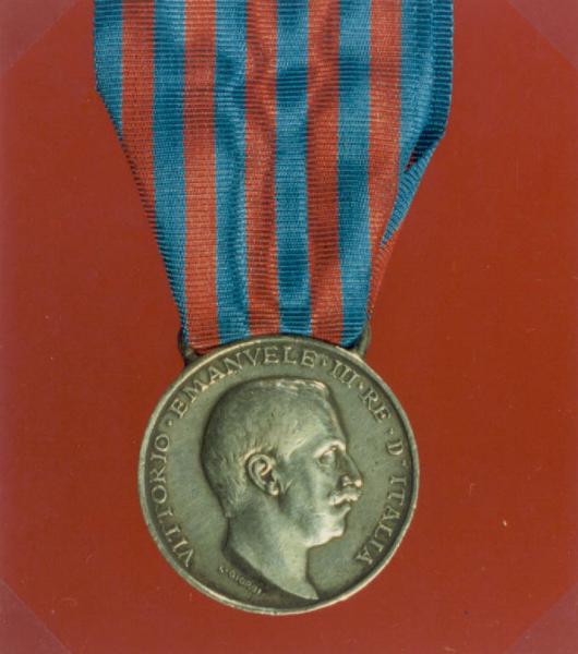 LA DECORAZIONE E' IN FORTE AGGETTO. NEL NASTRO SI ALTERNANO BANDE VERTICALI BICOLORE SECONDO IL SEGUENTE ORDINE: \nAZZURRO-ROSSO-AZZURRO-ROSSO-AZZURRO-ROSSO-AZZURRO-ROSSO-AZZURRO-ROSSO-AZZURRO, PER UN TOTALE DI 11 STRISCE