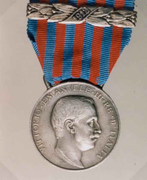 LA DECORAZIONE E' IN FORTE AGGETTO. NEL NASTRO SI ALTERNANO BANDE VERTICALI BICOLORE SECONDO IL SEGUENTE ORDINE: \nAZZURRO-ROSSO-AZZURRO-ROSSO-AZZURRO-ROSSO-AZZURRO-ROSSO-AZZURRO-ROSSO-AZZURRO, PER UN TOTALE DI 11 STRISCE. LA FASCETTA DI ALLORO SUL NASTRO RECA LA DATA 1912