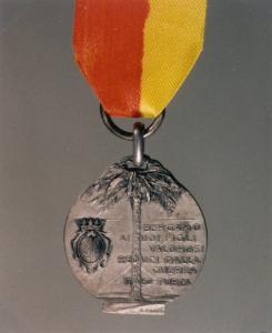 LA MEDAGLIA CIRCOLARE E' ALLUNGATA AI DUE ESTREMI INFERIORE E SUPERIORE CON, RISPETTIVAMENTE, UNA CARTELLA ED UN PROLUNGAMENTO FIGURATIVO. NELLA CARTELLA E' TRASCRITTA -SUL RECTO-LA DATA E LA SIGLA DELL'INCISORE, SUL VERSO IL NOME DELL'INCISORE. IL NASTRO E' BICOLORE, GIALLO A SINISTRA E ROSSO A DESTRA, OVVERO I COLORI DELLA CITTA' DI BERGAMO
