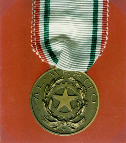 IL NASTRO E' DI COLORE BIANCO UNITO CON AI LATI DUE BANDE VERTICALI TRICOLORI. SUL NASTRO E' AFFRANCATO UN RAMO DI PALMA, DEL MEDESIMO MATERIALE DELLA MEDAGLIA