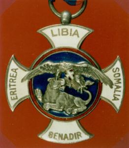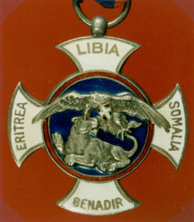 I BRACCI DELLA CROCE, SMALTATI IN BIANCO, SONO A INCUDINE SAGOMATA E SI DIPARTONO DA UNA MEDAGLIA CENTRALE SMALTATA IN ROSSO LUNGO LA CORNICE ED IN BLU NEL CAMPO. IN NOTEVOLE AGGETTO RISULTANO LE DUE FIGURE DELL'AQUILA CON LO SCUDO CROCIATO BIANCO IN CAMPO ROSSO CHE CAVA UN OCCHIO AD UNA LEONESSA. SUI BRACCI LE RELATIVE ISCRIZIONI RIPORTANTI I NOMI DELLE COLONIE ITALIANE IN AFRICA