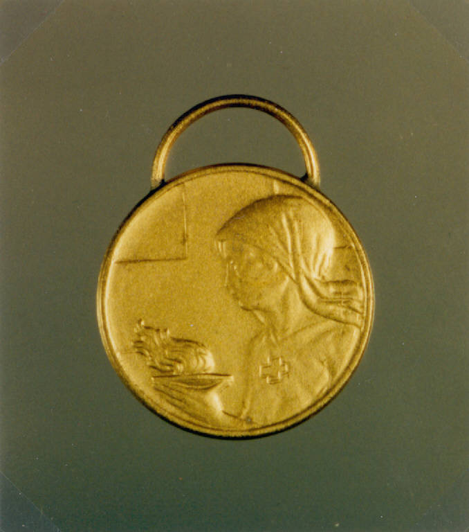 R: ALLEGORIA DELLA CARITA; V: CROCE DI GINEVRA. R: FIGURA MULIEBRE A MEZZO BUSTO CHE REGGE UN LUME ACCESO, CROCE, ISCRIZIONE; V: CROCE, ISCRIZIONE