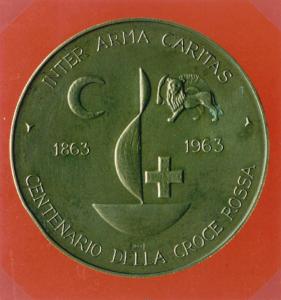 R: ALLEGORIA DEL SOCCORSO; V: SIMBOLI DELLA CROCE ROSSA INTERNAZIONALE. R: FIGURA MULIEBRE CHE PROTEGGE CON IL MANTO UN UOMO E UNA DONNA CON UN BAMBINO, ISCRIZIONE; V: LUME, MEZZALUNA RIVOLTA VERSO DESTRA, LEONE PASSANTE CON SCIMITARRA SOPRA A SOLE RAGGIATO, CROCE GRECA, ISCRIZIONE