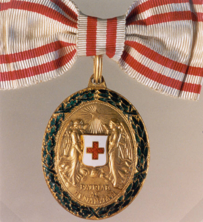 IL PENDENTE HA FORMA OVALE, LA CORONA DI ALLORO E QUERCIA CINGE LA PARTE INTERNA FIGURATA, GLI SMALTI SONO DESTINATI ALLE FRONDE, NELLA CROMIA VERDE, ED ALLO SCUDO RETTO DAGLI ANGELI, NEL BIANCO E ROSSO. IL FIOCCO E' DI COLORE BIANCO UNITO, PROFILATO DA UNA DOPPIA BANDA ROSSA AI LATI.