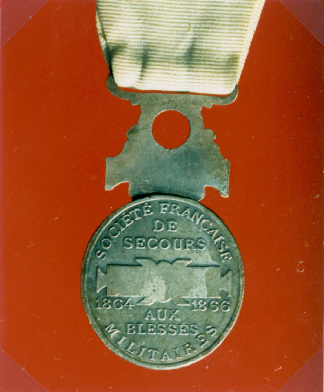 R: ALLEGORIA DEL SOCCORSO, CROCE DI GINEVRA. R: FIGURA MULIEBRE IN TORSIONE CHE SORREGGE UN SOLDATO FERITO, SULLO SFONDO UNA CROCE, ISCRIZIONE; V: ISCRIZIONE, CARTIGLIO