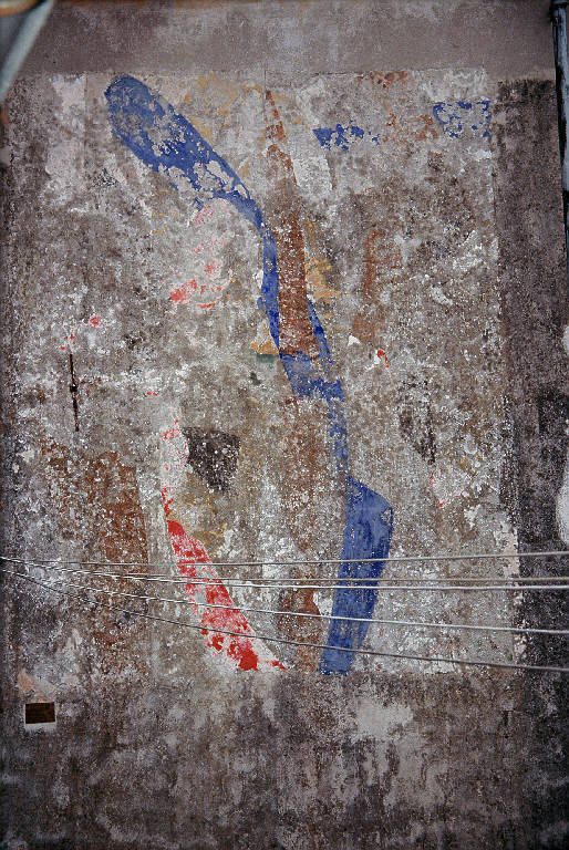 Affresco posizionato sulla facciata di una casa molto in alto particolarmente esposta alle intemperie.