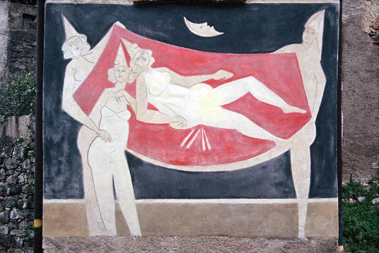 - NOTIZIE STORICO CRITICHE L'esecuzione dell'opera fu preceduta da una produzione di circa venti bozzetti eseguiti in Arcumeggia, ma poi la realizzazione dell'affresco fu completata in tre giorni. Il dipinto è un'interpretazione in chiave onirica della tematica celebrativa di riti e di tradizioni sociali o lavorative locali. Infatti il titolo originario era "Le donne di Arcumeggia" in quanto l'artista voleva rappresentare le mogli che nella dimensione del sogno, a cui alludono simbolicamente la luna e il copricapo da fata, pensavano ai mariti lontani per lavoro. Il parroco scandalizzato dai nudi femminili accostati alla citazione alle donne di Arcumeggia espose denuncia presso la Questura di Varese. In seguito Monachesi acconsentì a cambiare il titolo dell'affresco e qualche mese dopo un suo allievo vestì le donne con velature. L'artista, infatti, si era limitato a dipingere di giallo limone solo la figura adagiata sulla coperta rossa. Durante l'ultimo intervento di restauro è stato asportato il color bianco delle vesti, perchè non originale, ed è così riemerso il giallo originario.