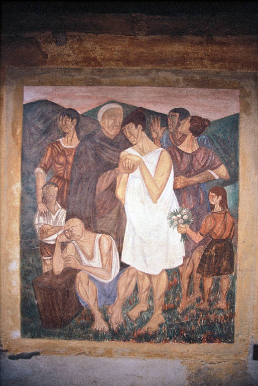 - NOTIZIE STORICO CRITICHE L'opera di Migneco riprendeva perfettamente il filone, nato ad Arcumeggia con Usellini e Brindisi, di descrivere e celebrare la dignità e la sofferenza dell'emigrazione. Il tema era molto sentito a livello locale dato che il fenomeno era molto diffuso nella Valcuvia. Le scelte stilistiche si discostano, però, da quelle dei suoi predecessori, infatti, i personaggi del dipinto sono raffigurati secondo dei concetti formali che risentono degli echi del Cubismo.