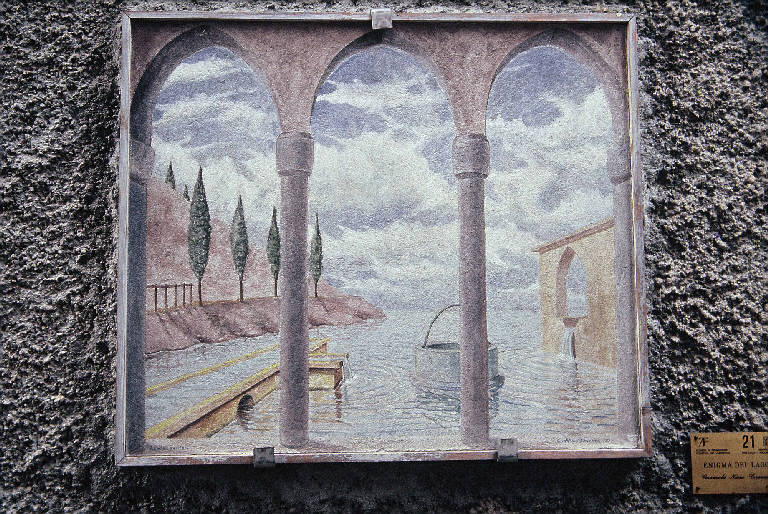 - NOTIZIE STORICO CRITICHE Il dipinto raffigura un misterioso lago osservato attraverso un loggiato a tre archi poggianti su quattro colonne. Sulla destra e sulla sinistra scendono da strutture architettoniche due piccole cascate, al centro è collocato un pozzo, mentre la riva rocciosa è ingentilita da ordinati cipressi. Il tema della "acque sognanti" è stato ampiamente trattato dall'artista tra la fine degli anni ottanta e l'inizio degli anni novanta. Il significato di questo tema è stato esaurientemente spiegato da Aligi Sassu nel corso della presentazione della mostra dedicata a Trovato nel 1989.