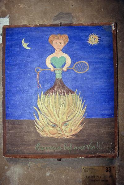 - NOTIZIE STORICO CRITICHE Il soggetto dell'affresco rientra nella tematica della vena ironica e surreale caratteristica di tanta pittura dell'artista. L'ammonimento a Severino è visualizzato dalle fiamme che avvolgono il fiasco. L'ambiguità del messaggio è, però, palese in quanto dal collo della bottiglia fuoriesce un'avvenente figura femminile, frutto delle visioni che la bevanda può procurare. Enigmatico risulta anche il messaggio delle figure del sole e della luna di reminescenza medioevale. La scelta surreale della figura che esce da un contenitore in vetro non era nuova per Usellini, infatti, l'artista aveva già adottta la medesima soluzione anche in un "Autoritratto" datato 1953.