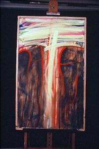 Affresco eseguito su formella di truciolato ricoperta di intonaco con intelaiatura in legno.