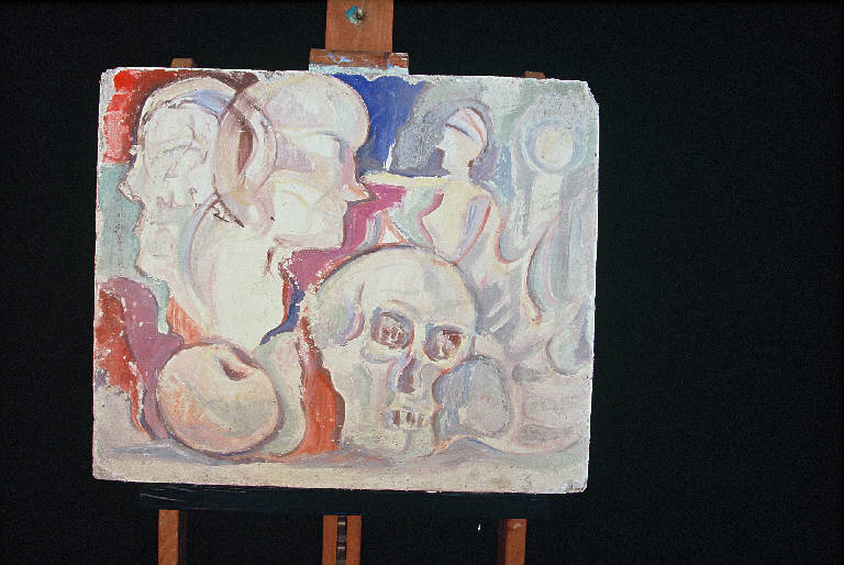 - NOTIZIE STORICO CRITICHE In primo piano compaiono una mela e un teschio in forme astratte, sullo sfondo profili sempre astratti, realizzati con colori sfumati.
