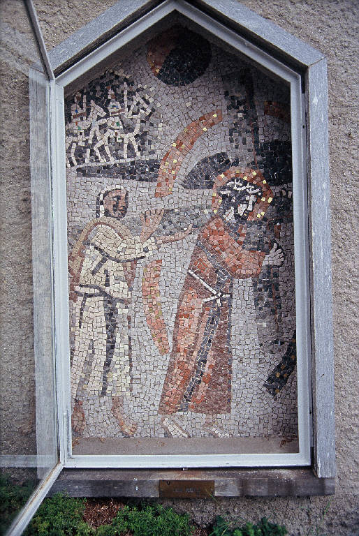 - NOTIZIE STORICO CRITICHE L'opera è articolata in due spazi scenici: in primo piano sono raffigurati Cristo con la croce e il Cireneo nell'atto di aiutarlo, in secondo piano invece sono raffigurati due soldati a cavallo. Ancora sconosciuto resta il motivo che spinse a realizzare quest'unica stazione con la tecnica del mosaico.