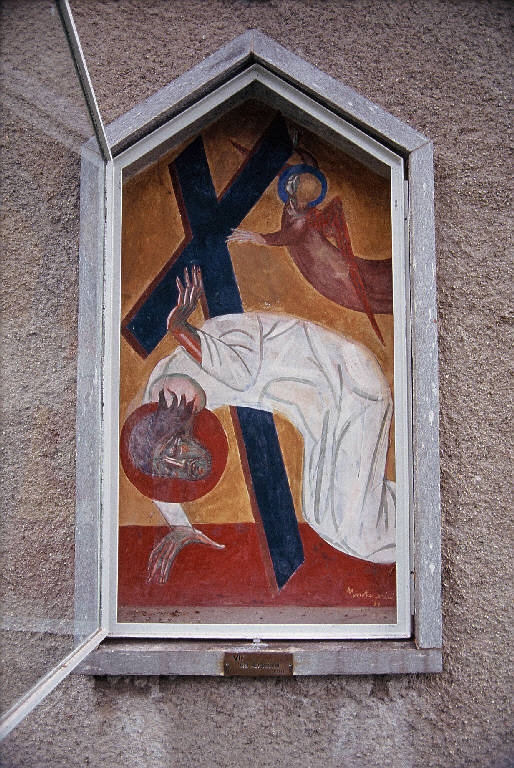 - NOTIZIE STORICO CRITICHE La parte inferiore dell'affresco è occupata dalla figura del Cristo, piegata sotto la croce, mentre un angelo collocato nella parte superiore lo soccorre. Secondo quanto attestano alcune fotografie dell'epoca, probabilmente Montanarini eseguì una prima versione dell'affresco immediatamente sostituita da quella attuale. Nella prima versione il Cristo era raffigurato nell'atto di cadere mentre alle sue spalle due mani nell'atto di colpire sorreggono una frusta e un bastone. Nel corso di un sopralluogo nel 1960 i restauratori Mario Rossi e Mario Pigozzi segnalarono i problemi di conservazione presentati dall'affresco di Montanarini, tuttavia ritenuti risolvibili con una pulitura e alcuni ritocchi. Per eseguire l'intervento si offrirono sia Usellini sia Montanari.