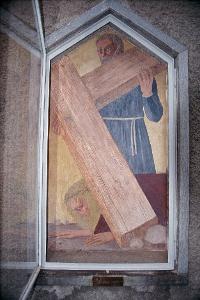 - NOTIZIE STORICO CRITICHE L'opera è dominata dalla struttura possente della croce, posta trasversalmente e vista solo per metà, che definisce lo spazio della scena. Sotto giace Gesù con gli occhi rivolti al suolo mentre un uomo, vestito d'azzurro, sorregge la croce. Il significato simbolico della scena è forte e sottolinea la tragicità dell'evento.\nL'affresco subì immediati danni, infatti, il 9 aprile 1960, durante un sopralluogo si decise di rifarlo completamente. I restauratori Mario Rossi e Mario Pigozzi attribuirono le cause dei danni al gelo eccessivo che aveva determinato un distacco dell'intonaco affrescato dall'arriccio. Usellini realizzò un nuovo affresco e al momento si può solo supporre che lo eseguì mantenedo la stessa iconografia.