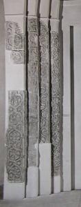 Stipite con un pilastro a spigolo vivo e tre successive strombature.Rimangono tre frammenti del primo pilastro da sinistra, quattro del secondo, due del terzo e due del quarto.