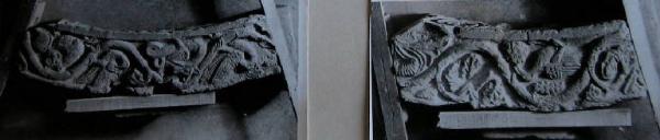 Frammento di ghiera con decorazioni vegetali e animali scolpiti.
