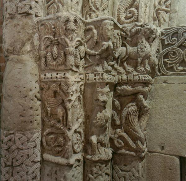 Capitello a doppia fascia diviso da una banda scolpita. L'ordine inferiore è caratterizzato da animali scolpiti, mentre quello superiore da decorazioni vegetali.