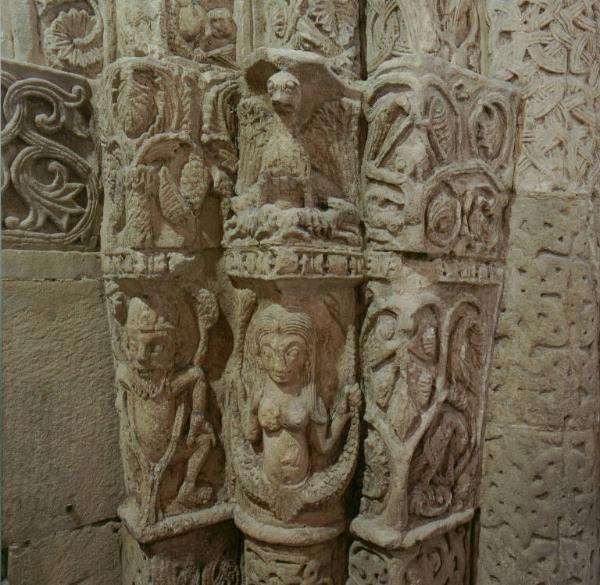 Capitello a doppia fascia diviso da una banda scolpita. La parte inferiore è careatterizzata da una strana figura antropomorfa a gambe divaricate reggente due rami nelle mani. La parte superiore è scolpita a motivi vegetali.