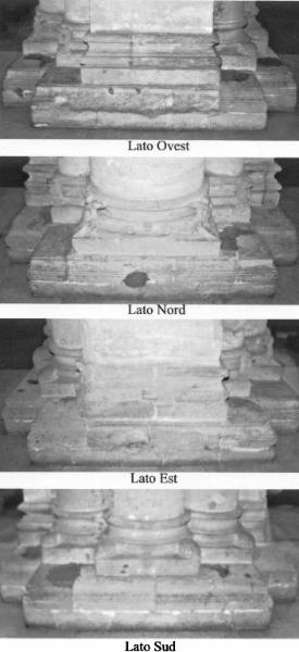 Base attica di sostegno con plinto sormontato da due tori inframmezzati da due listelli e da una scozia. Sul lato Nord sono presenti due leoni monocefali fra i due tori della semicolonna di sinistra, e due coppie di mostri marini le cui code si incrociano a formare una mascherina fra i due tori della semicolonna centrale, e due leonesse fra i due tori della semicolonna di destra.